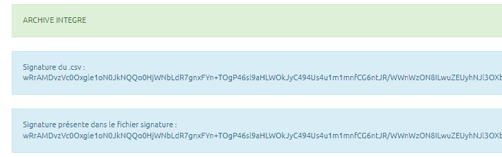 Vous pouvez vérifier l’intégrité de l’archive en téléversant le fichier archive .csv ainsi que le fichier contenant la signature